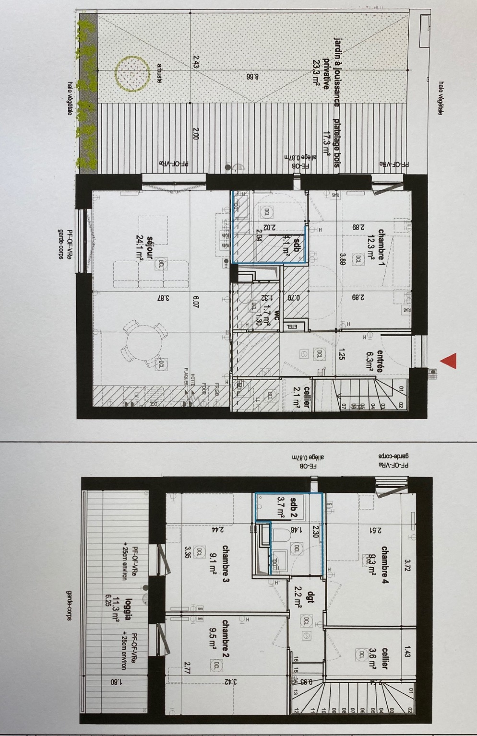 A l'étage, se trouvent 3 chambres d'environ 9,5m2 chacune, un grand dressing et une salle de bain avec WC. 2 des chambres ont accès à une loggia de 11m2.