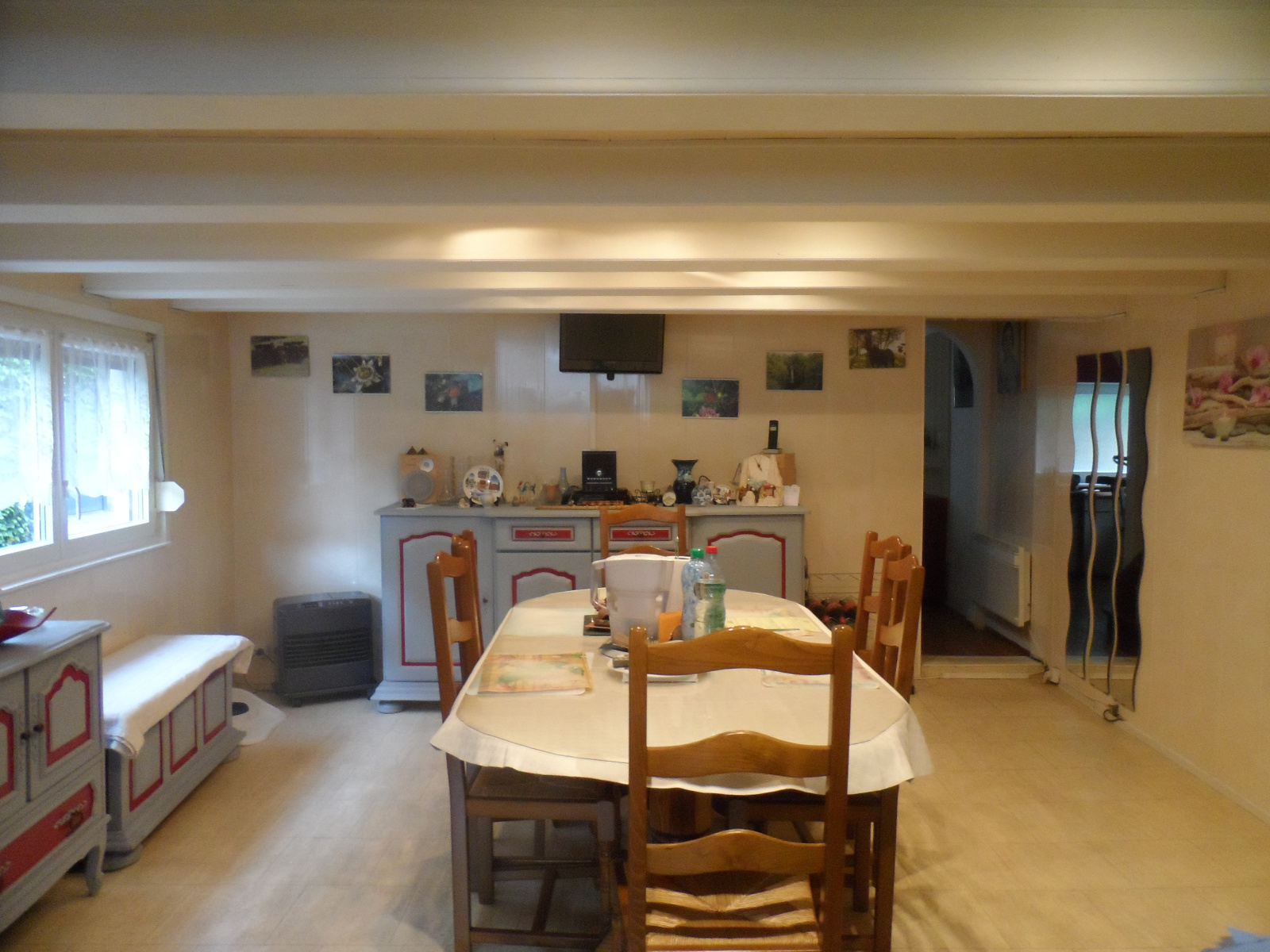 1 entrée, 1 séjour cuisine US, 4 chambres 1 salle de douches, 1 wc, 1 bureau, 1 patio, 1 cave 1 grand garage, 1 place de parking.
