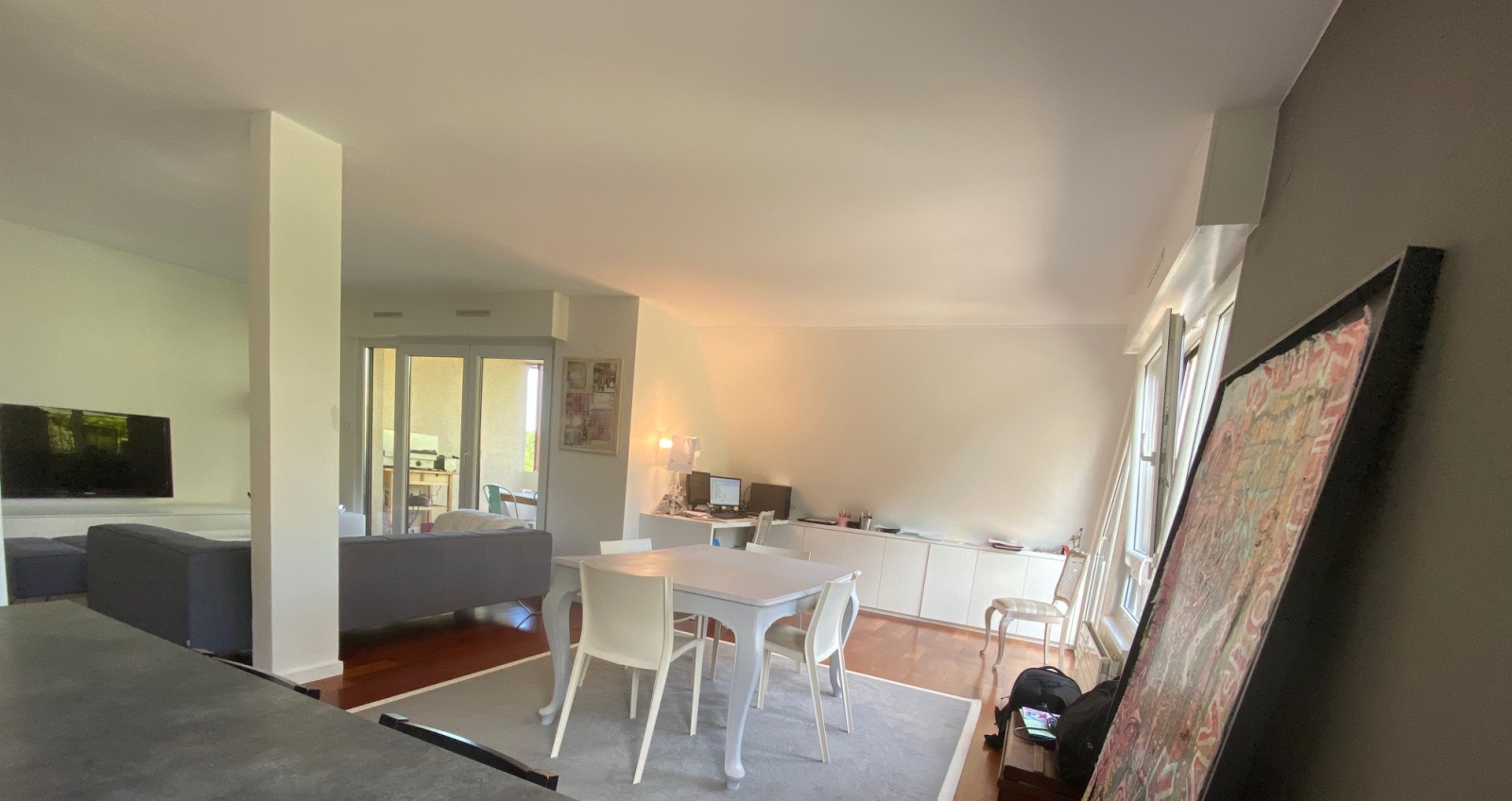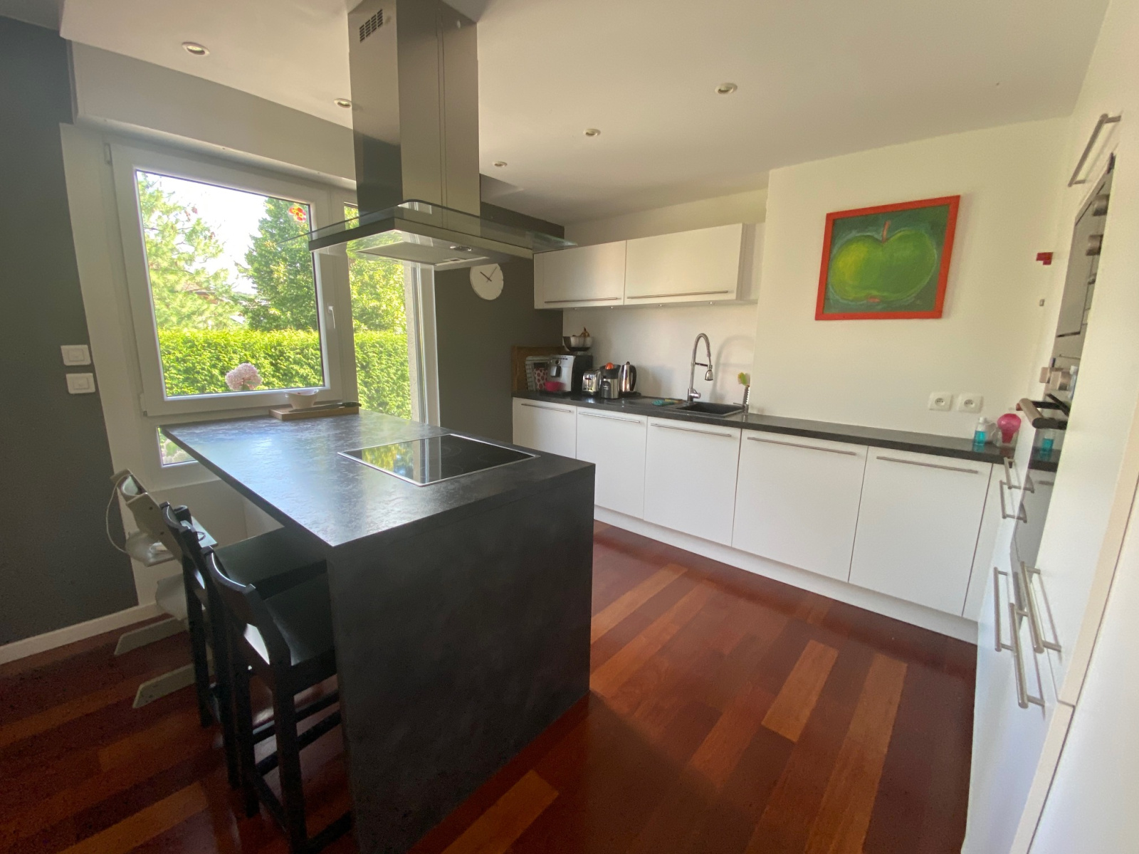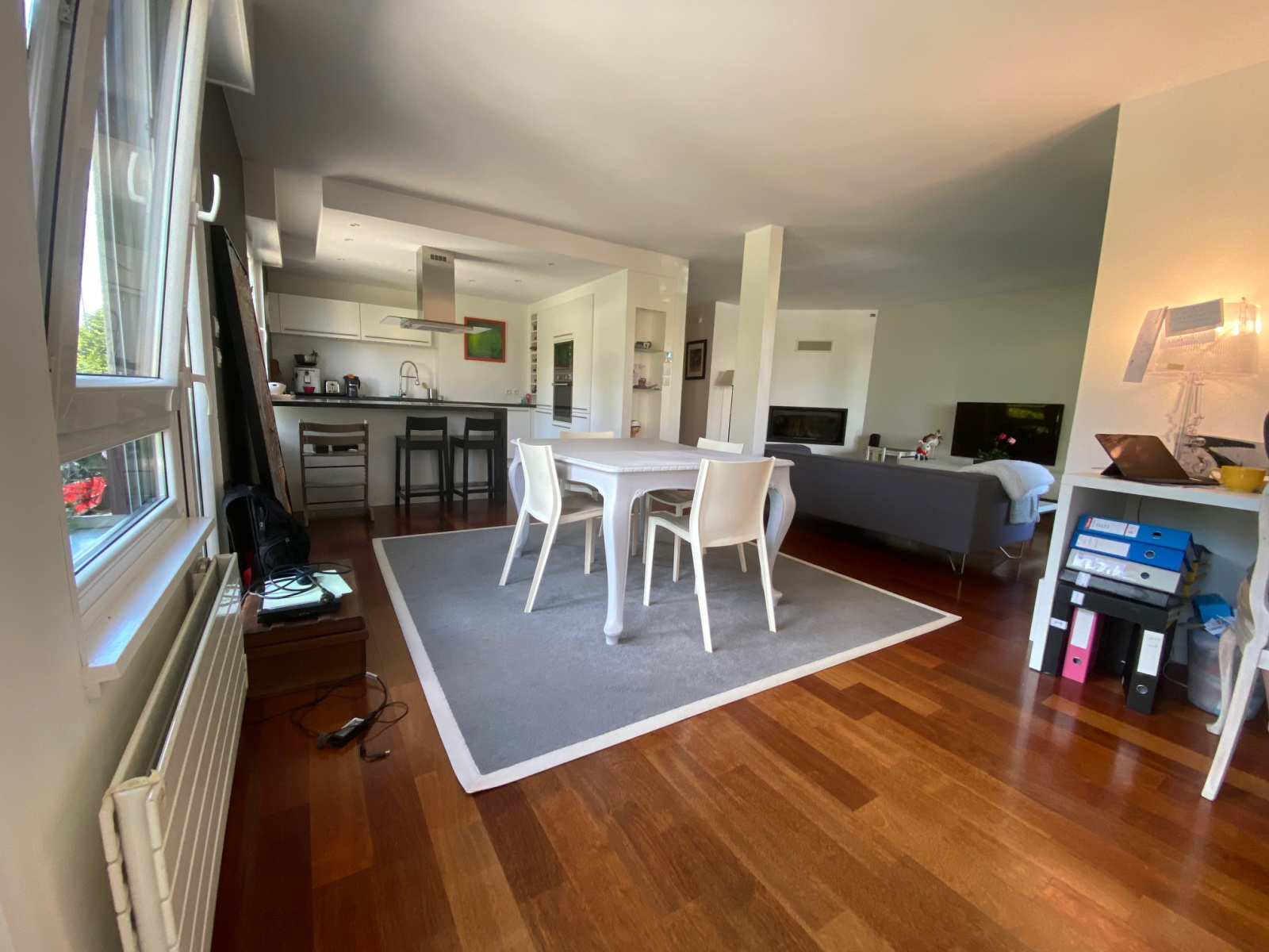 Il se compose d'un très beau séjour de plus de 60m2 environ avec une magnifique cheminée bois 16/9ème et une très belle cuisine ouverte toute équipée, un espace bureau entièrement aménagé sur-mesure, trois chambres de 13, 12 et 9m2 au Nord-Est, chacune avec placards intégrés sur-mesure, une salle de bain avec douche et baignoire, un WC indépendant avec lave-main.
